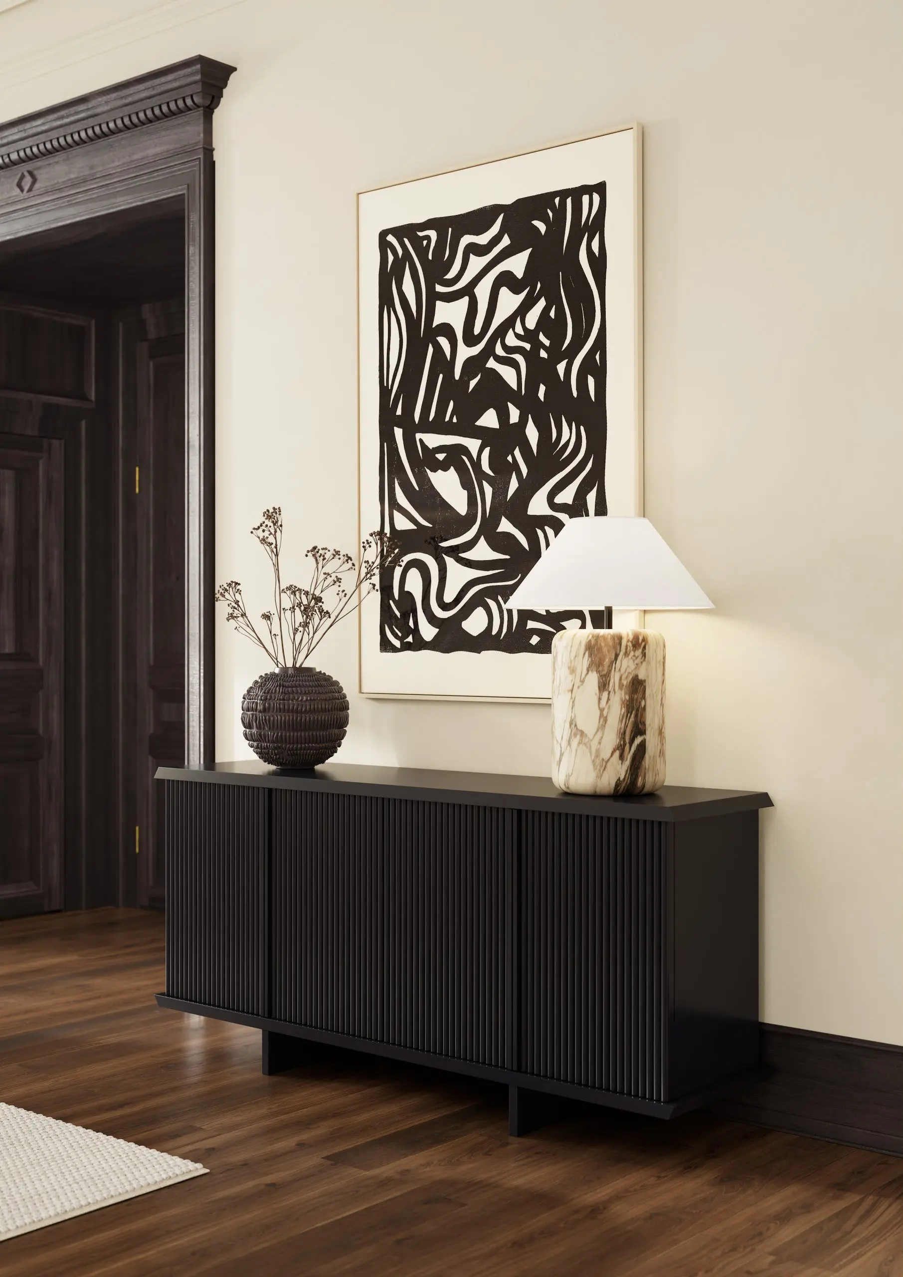 Quartz Blackpool countertops in matte step right off these wood cabinets, creating dimension that commands attention. As well as creates a stunning fireplace design, along with this dinning room attache. In addition, this vast and commanding, powerful design is darkest ebony with a stealthy silken Cambria Matte™ finish that absorbs light like a starless night over the Irish Sea. Cambria is Family Owned and American Made.